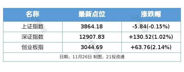 11月26日,深成指、创业板指双双低开高走,创业板指盘中一度涨超3%。截至收盘,沪指跌0.15%,深成指涨1.02%,创业板指涨2.14%。沪深两市成交额1.78万亿元,较上一个交易日缩量288亿元。