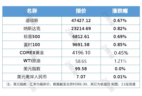 纽约股市三大股指11月26日上涨。截至当天收盘,道琼斯工业平均指数比前一交易日上涨314.67点,收于47427.12点,涨幅为0.67%;标准普尔500种股票指数上涨46.73点,收于6812.61点,涨幅为0.69%;纳斯达克综合指数上涨189.10点,收于23214.69点,涨幅为0.82%。