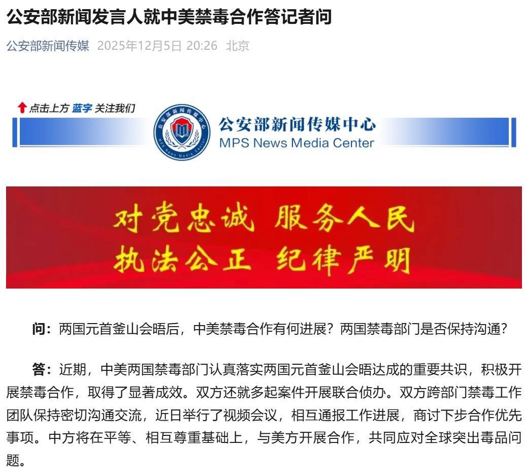 答:近期,中美两国禁毒部门认真落实两国元首釜山会晤达成的重要共识,积极开展禁毒合作,取得了显著成效。双方还就多起案件开展联合侦办。双方跨部门禁毒工作团队保持密切沟通交流,近日举行了视频会议,相互通报工作进展,商讨下步合作优先事项。中方将在平等、相互尊重基础上,与美方开展合作,共同应对全球突出毒品问题。